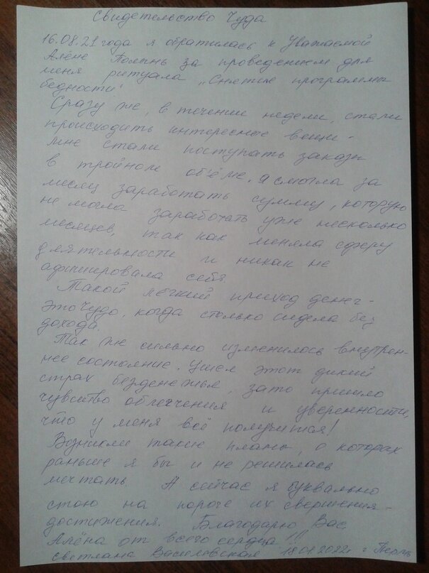 Нам прислали отзыв с благодарностью Алене Полынь за помощь. Как изменилась Жизнь Светланы после обращения к Ведьме, читайте ниже. 16.08.2021 года я обратилась к уважаемой Алене Полынь за проведением для меня ритуала «Снятие программы бедности».