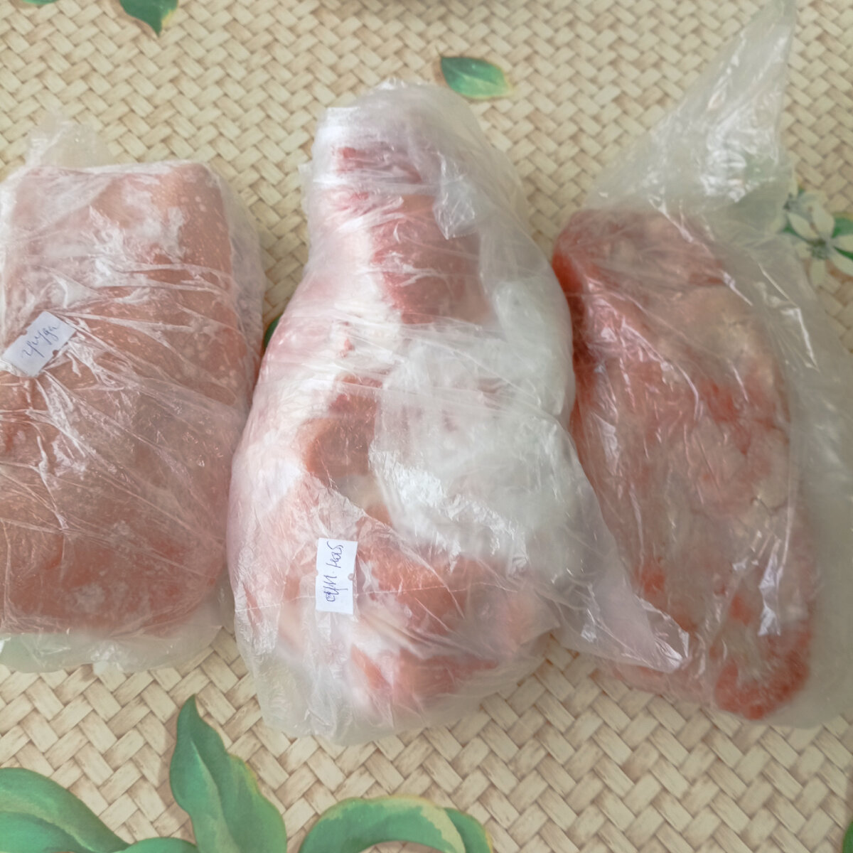 А тут всего понемногу. Слева сверху шейка свиная. Покупали на Новый год на горшки. Но как вы помните, я готовила курицу. Горшки будут позже. Справа баранина, надо приготовить плов. Внизу четвертинка деревенской курицы. Это всё, что осталось от целой. Варю из неё суп. Пельмени фермерские - это внуку.