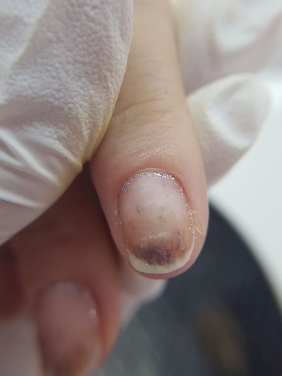 После ожога ногтевой пластины (хоть химического, хоть термического) мы видим такую картину. Многие путают ее с грибком и усиленно лечат его, что будет безуспешно. Кто же обращается к дерматологу или подологу, то узнает, что это ожог. И в рекомендациях им дается строгий запрет на покрытие ногтей даже лаком. Но мы по граблям не ходим, мы - танцуем...и покрываем "самыми гипоаллергенными" гель-лаками, лаками, акрилом. Хочется красивые ноготки, понимаю вас... После химического ожога ногти покрывать искусственным материалом НЕЛЬЗЯ, потому что после того как произошла сенсибилизация любое покрытие будет провоцировать рецидив.
