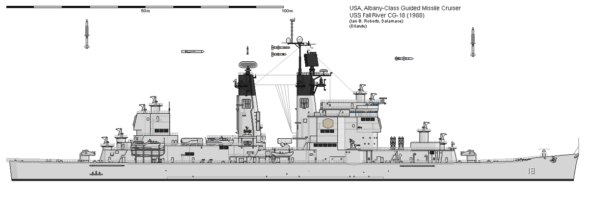 Итак, это CG-18 USS "Фолл Ривер" (ранее CA-131 "Фолл Ривер", тяжелый крейсер типа «Балтимор»), перестроенный сначала в 1960-ых в ракетный крейсер типа «Олбани», а затем в 1980-ых прошедший модернизацию под систему «Aegis».