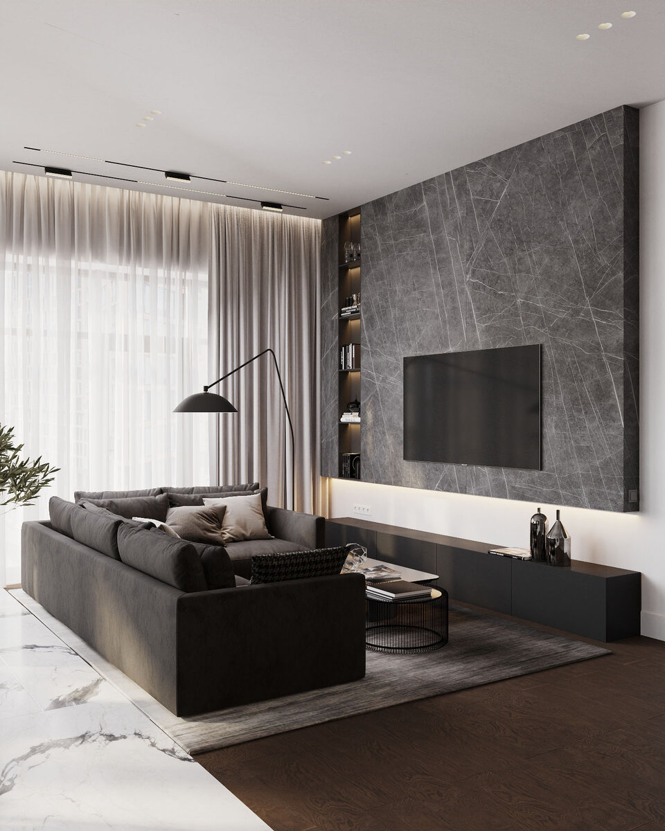Раньше в гостиной было принято ставить огромный мебельный гарнитур в виде шкафов со множеством ящичков, полок и ниш из одной коллекции мебели, а по центру всей композиции на тумбу ставить телевизор. И когда-то это было очень популярно, но точно не сейчас. Сейчас у зоны ТВ совсем другое представление в дизайне. Рассмотрим 10 идей оформления зоны ТВ на примере работ нашей студии INTERSIO 1 вариант Выступающий короб до потолка, облицованный крупноформатным тёмно-серым матовым керамогранитом с нишей для чёрных полочек с подсветкой + гладкая напольная чёрная тумба 2 вариант Выступающий короб до потолка, облицованный крупноформатным бежевым глянцевым керамогранитом с латунными вставками + напольная бежевая рельефная тумба + чёрный акцентный портал для камина + открытый стеллаж до потолка с подсветкой 3 вариант Парящая панель из шпона ореха с латунными вставками и подсветкой по периметру + напольная тумба из светло-серого матового керамогранита + комбинированный портал для камина из рельеф
