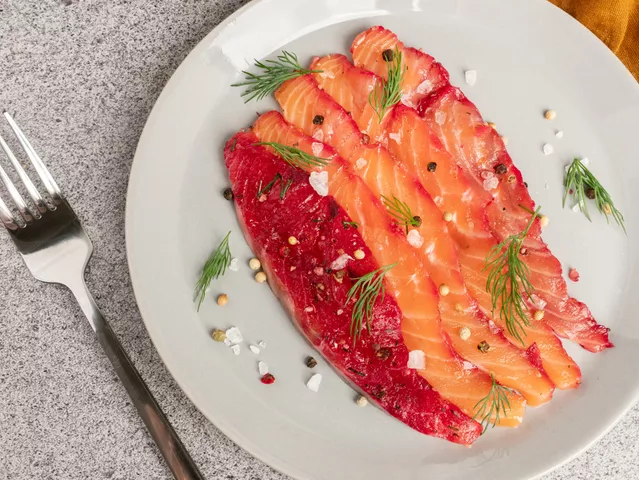 Рецепт этого лосося пришел к нам из Скандинавии. Его готовят в Норвегии, Швеции, Дании, Исландии, Финляндии. Главным ингредиентом такого блюда является лососевая рыба. Это может быть форель, горбуша или лосось, как в нашем рецепте. Для маринада берется соль крупного помола, сахар, черный перец и свежий укроп. Мы предлагаем также добавить свеклу. Она придаст рыбе необычный цвет. Такое блюдо отлично подойдет для новогоднего стола, а также непременно станет украшением и других праздников.