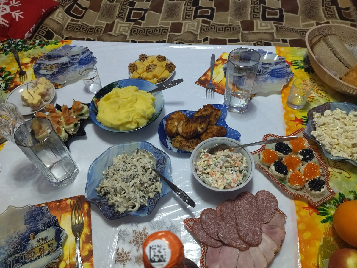 Смотрю, тут все своими новогодними столами хвалятся🙂 И я не буду от всех отставать 😁 Правда, хвалиться мне особо нечем, стол был совершенно простой, безо всяких изысков. Все блюда простые и из доступных продуктов. Отмечали мы только своей семьёй - вчетвером, без гостей - поэтому много не готовили. Да может и вообще бы не готовили, если бы не дети. Выпили бы с мужем шампанского, закусили мандаринами и легли бы смотреть телевизор. Настроения новогоднего не было до самого боя курантов. И после него оно тоже не появилось. А наутро вообще, как будто бы и не было ничего. Как будто и не готовили, и не сидели, и не ели 🤷♀️ Но дети хотели праздника, елку, подарки и "поесть ночью в комнате за большим столом". И оставить детей без праздника я просто не могла. Вот так выглядел наш скромный праздничный стол. Салатов у нас было три Изначально готовить его не планировали, но старшая дочка недавно распробовала этот салат и очень просила приготовить на новый год. Рецепт писать не буду, все е