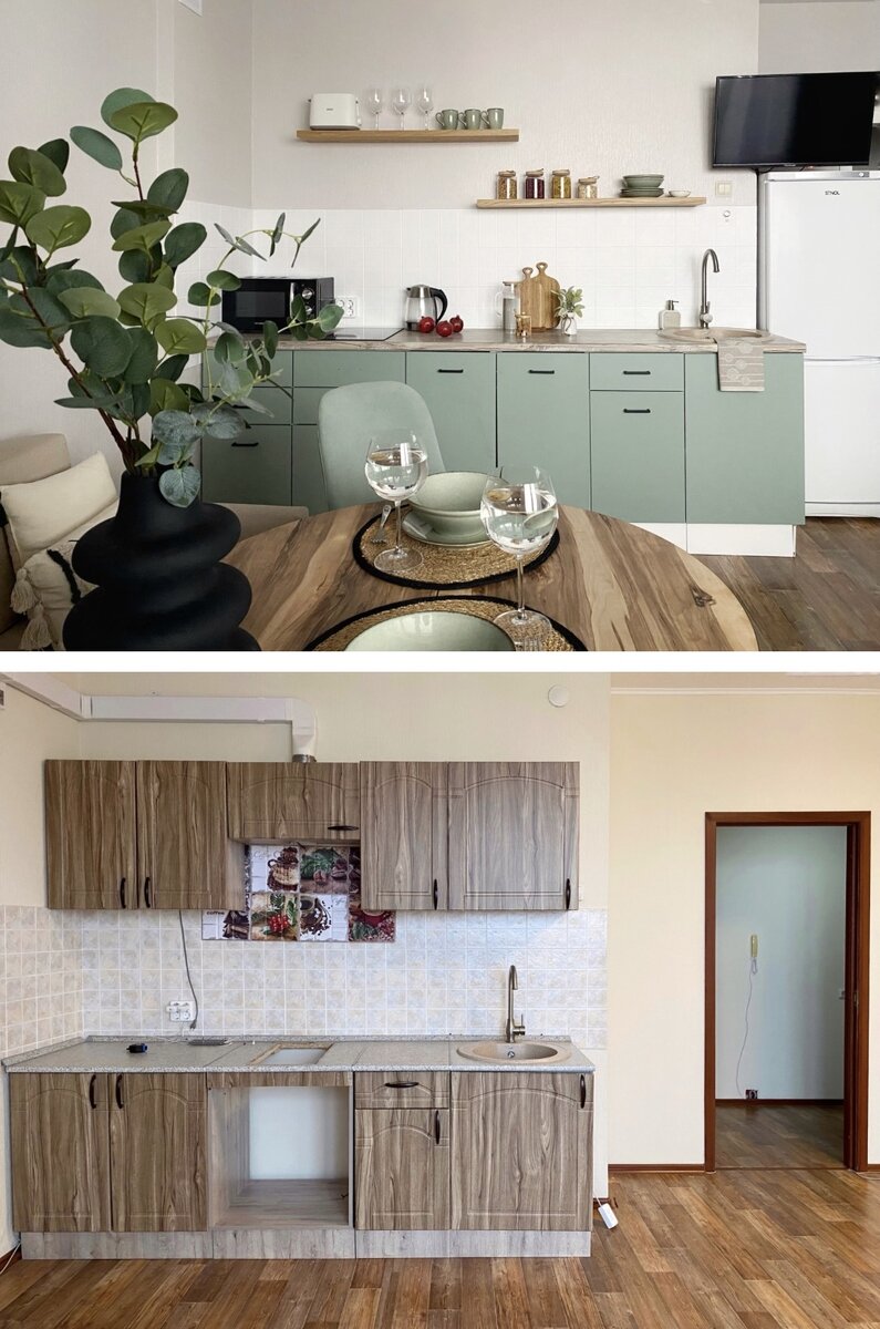 Квартира 30,8 кв м. в Новосибирске. Собственница-рантье купила её для сдачи в посуточную аренду. Я помогаю Александре готовить уже третью квартиру! Капитальный ремонт делать не планировали, но чтобы освежить квартиру, а также придать ей более современный вид и подстроить под нашу концепцию, было решено покрасить обои во всей квартире. Бежевый оттенок краски мы выбрали Dulux 50YR 73/022, зеленый цвет акцентной стены - Dulux 90GY 46/056, сохраняйте сразу, так как это очень популярный вопрос!🤗 Также в комнате натянули новые потолки, чтобы добавить освещение над кухней, а также над кухонным столом. Кухонный гарнитур поменяли, он обошелся всего в 30 тыс! Покрасили кухонный фартук. Также поменяли двери, наличники, плинтуса. В ванной зашили трубы гипсокартоном, покрасили стены в акцентный цвет, поменчли всю сантехнику (кроме ванны), добавили экран и дверку, скрывающую коммуникации и счётчики. Для хранения: выдвижные ящики под кроватью, комод и пенал в прихожей, вешалка для верхней одежды