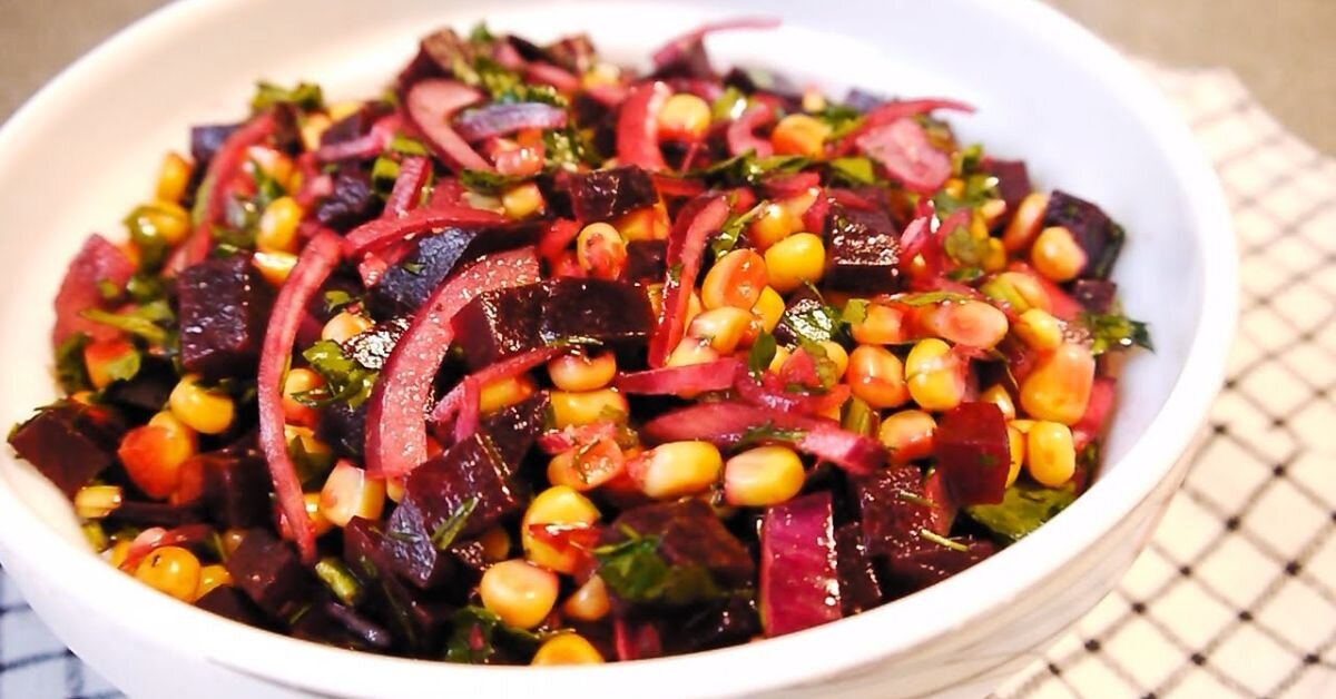 Прежде всего, салат со свеклой и кукурузой привлекает внимание своей яркостью. К тому же готовится он очень просто, а вкус получается на удивление сбалансированным и гармоничным. Вареная или запеченная свекла придают блюду уместную нежность, кукуруза разбавляет его сладостью, а заправка из лимонного сока и чеснока добавляет нотку пикантности. Редакция «Со Вкусом» уверяет, что такая полезная закуска может запросто сравниться по своей сытости с салатами на майонезной основе. Тогда зачем нам эти лишние калории, есть есть такая чудесная альтернатива? Пока еще не настал сезон свежих овощей, порадуйте свой организм таким здоровым, а главное, быстрым в приготовлении блюдом! Вкусный салат со свеклой и кукурузой: нюансы приготовления Многие хозяйки не понимают, зачем запекать свеклу, если ее можно просто отварить, очистить, а затем использовать для салатов, закусок, горячих блюд и даже выпечки. Приведем главный довод в пользу приготовления в фольге: запеченная в духовке свекла становится караме