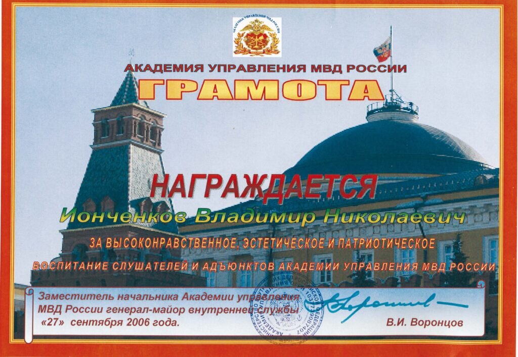 Почётный академик ИАСК Ионченков Владимир Николаевич имеет почётные знаки и Грамоту от МВД. Сам он о том пишет так: