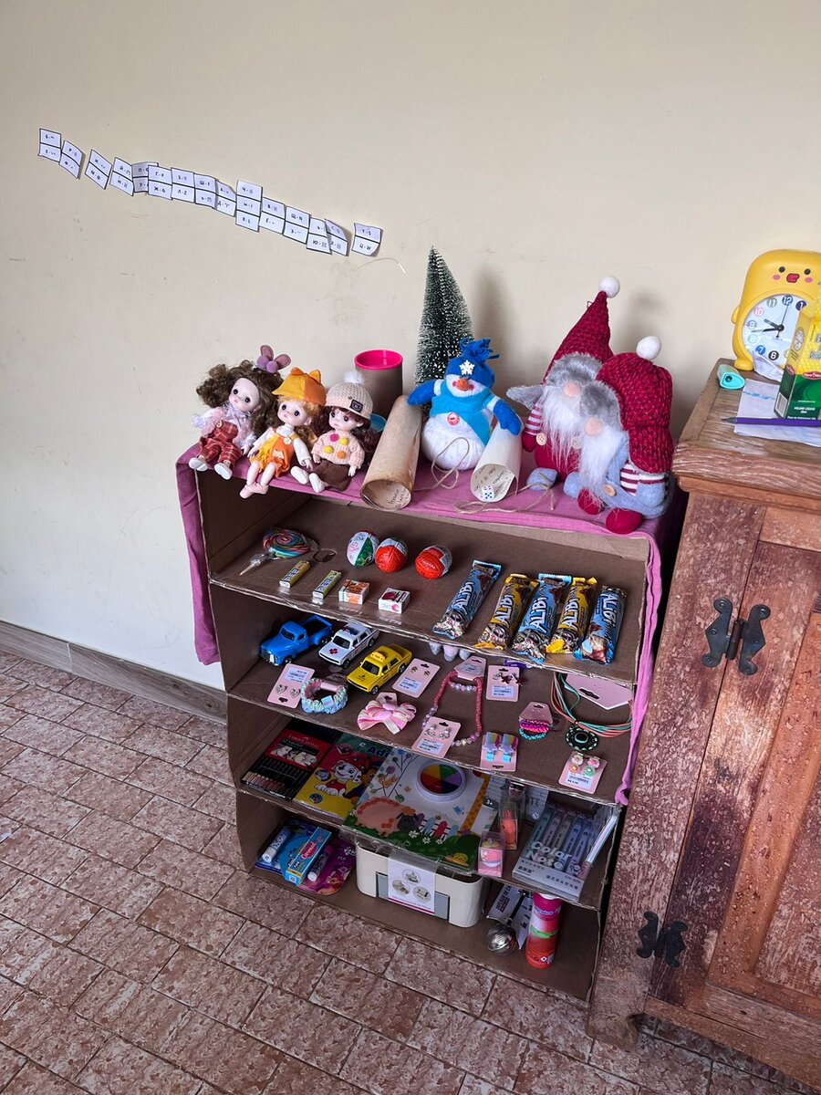 31 декабря стало последним днем новогоднего квеста Моти. Утром девочек ждал первый сюрприз - появил магазинчик с множеством маленьких и разнообразных предметов на витринах. На полке магазинчика сидели все герои квеста: Мотя, Злот и Доброт и три сестренки (Сати, Сави и Йока). Украшения, игрушки, канцелярия, косметика. Маленькие приятные мелочи. Жигули с надписями на русском особенно развеселили детей. В письме от Моти дети нашли объяснение: часть заработанных монет они должны отдать Злоту и Доброту, чтобы купить домики для Сати, Сави и Йоки. А остальные монетки нужны для игры, которая состоится поздно вечером, чтобы обменять их на подарки. Весь день я краем уха слышала, как девочки договариваются, кто что "купит" из вещичек и порадовалась, что они не поссорились, а договорились мирно. Собстенно, подарки явно выбирались так, чтобы каждый подошел конкретному ребенку и не было ссор. Например, розовый единорог наверняка понравился бы Соне, а Валюша присмотрела бы себе дезодорант с запахом м