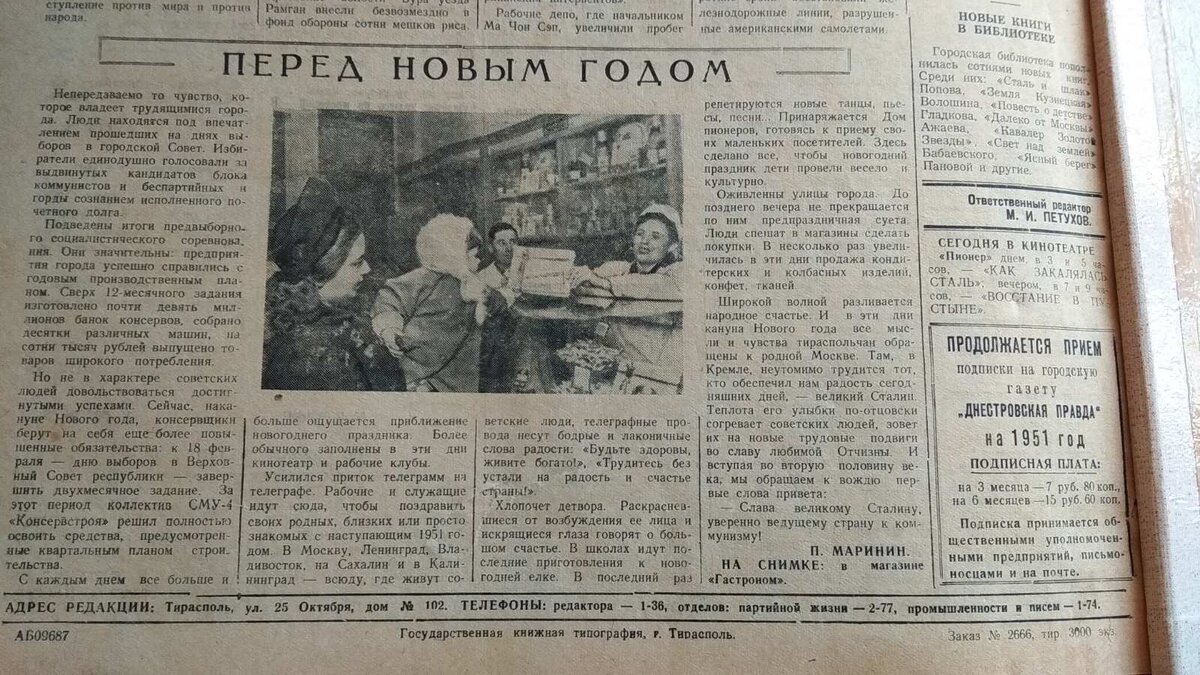 В фондах Тираспольского музея бережно хранятся подшивки газеты «Днестровская правда», печатного органа городского совета трудящихся тех лет. Внимательно перелистывая страницы, автор обращает ваше внимание на предпраздничные передовицы, поздравления и необыкновенные заметки, написанные тираспольчанами, и о них. А в это время в Тирасполе: «Усилился приток телеграмм на телеграфе. Рабочие и служащие идут сюда, чтобы поздравить своих родных, близких или просто знакомых с наступающим 1951 годом. В Москву, Ленинград, Владивосток, на Сахалин и в Калинин - всюду, где живут советские люди, телеграфные провода несут бодрые и лаконичные слова радости: «Будьте здоровы, живите богато! «Трудитесь без устали на радость и счастье страны!».