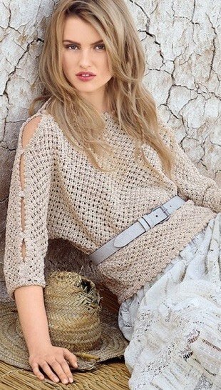 Одновременно в первом ряду плечевого скоса закрыть для выреза горловины центральные 25/27/29/31 п. и в каждом втором ряду у края выреза 1 х 2п., 1 х 1 п.