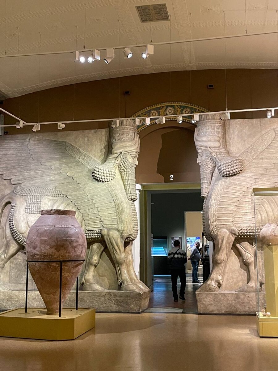Как только мы входим в зал, нас встречают два крылатых быка из дворца Ашшурнацирапала Второго ( царя Ассирии, годы жизни 884-859 до нашей эры). Их называли Шеду, Шиду Ламусу или Аладламу( на шумерском языке). Если присмотреться, то можно увидеть пять лап, а не четыре. Их основная задача заключалась якобы в защите дворцов и городов. Все эти слепки плит, которые можно увидеть в зале - часть оформления дворца ассирийского царя Ашшурнацирапала II, который правил в городе Кальху. Сейчас этот город называется Нимруд, это территория современного Ирака. К сожалению, в 2015 году город взорвали. Надпись, оп