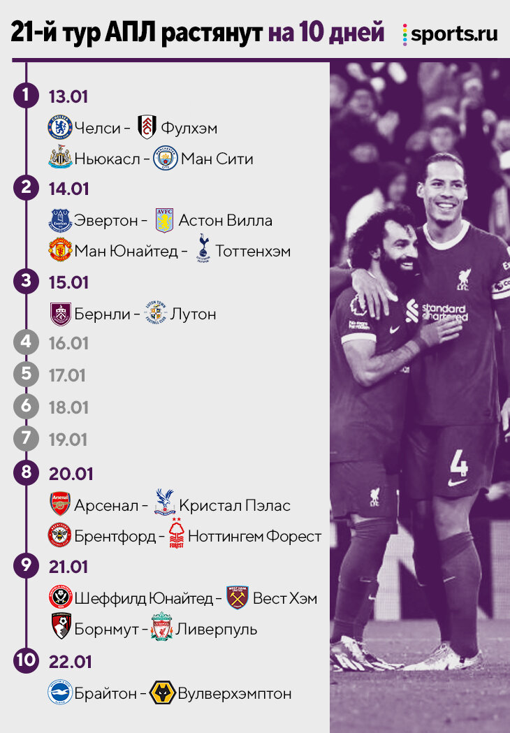 Но Кубки играют. АПЛ ушла в небольшой отпуск – следующий тур начнут только через полторы недели. И у него будет особая структура. Десять дней на тур. Так отдыхают вместо Рождества Оцените расписание 21-го тура АПЛ. За первые три дня отыграют пять матчей, потом снова перерыв на четыре дня, остаток тура закроют еще за три дня. После АПЛ вернется к стандартной формуле – 2-3 дня на один тур. В прошлом сезоне такой паузы не было из-за ЧМ-22 (вернулись под конец декабря, пришлось нагонять), а вот за сезон до этого такой перерыв тоже делали. Причина проста – только в АПЛ и Серии А играли под новогодние праздники, но в Англии график жестче – с 4-го по 8 января там 1/32 финала Кубка, которая начинается сразу после матчей АПЛ. Итог – в отрезок с 21 декабря по 8 января уместилось три тура чемпионата и один этап Кубка. Получается, что к старту 21-го тура (13 января) футболисты оставались вообще без зимней паузы. Из-за этого и придумали трюк с растягиванием тура. До следующего раунда Кубка (27 янва