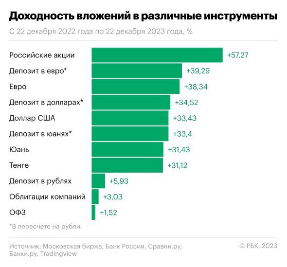 «РБК Инвестиции» составили традиционный рейтинг финансовых инструментов по доходности за прошедший год. При пассивном инвестировании наибольшую прибыль обеспечили вложения в акции российских компаний — индекс Мосбиржи полной доходности вырос на 57,27%. Следующие восемь мест по доходности распределили между собой валютные инструменты.