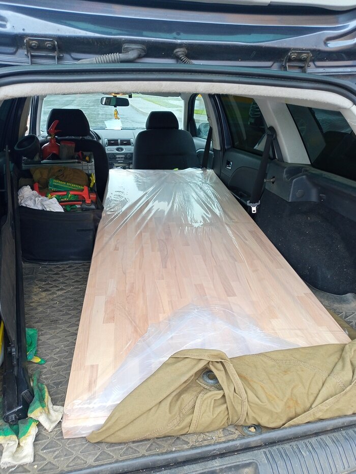 Уже несколько лет есть у нас традиция с коллегой делать подарки на ДР друг другу. Оба летние, у обоих дачи. Он мне инструмент какой-то, а я что-то сделанное своими руками. В том году попросил стол обеденный, чтоб большую семью на террасе можно было усадить. Понял, принял. Погнал в Вудсток за столешницей. Заодно и себе прикупил такую же столешку, чтобы на новую кухню поставить. Нарезал под размер, закруглил углы, снял фаску и шлифанул орбиталкой обе стороны. Покрыл прозрачным акриловым лаком 3 раза свою деревяшку, а товарищ выбрал масло на дубовую морилку. А я принялся за сварку подстолья из профиля. И вот столы готовы. Осталось эту тяжесть развести. Но от трехметровых столешниц оставались два куска, которые тоже пошли в дело. Обрадовал подарком еще 2 семьи журнальными столиками. Первый кусок округлил в стиле 70-х и покрыл акриловой морилкой цвета венге. Ножки покупал в озоне, по стилю, имхо, подошло неплохо. А вот второй кусок оказался очень капризным и его стало гнуть по ламелям. Реши