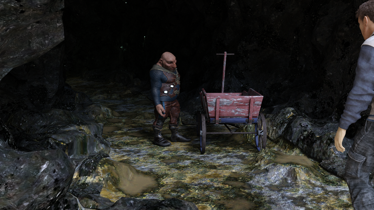 Полет завершился на каменном уступе. Разбиться паре не дал воздушный поток, мягко подхвативший летящие тела и опустивший их около еще одной вагонетки на рельсах. Рядом с вагонеткой висел указатель, что путь идет дальше в пещеры.