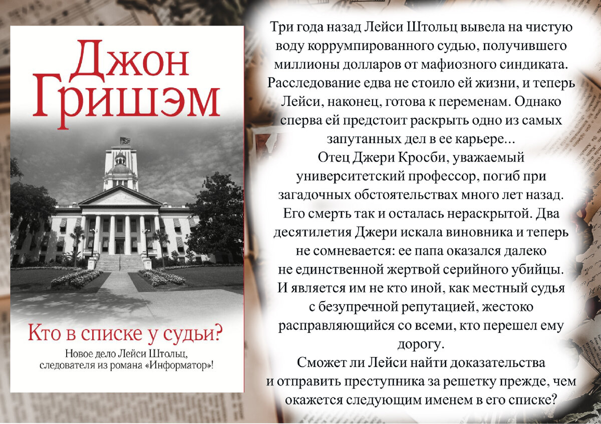 В подборке собраны как классические детективы, так и темные триллеры будоражащие воображение, плюс не много волшебства. Кто в списке у судьи? Гришэм Джон Новая книга от автора бестселлеров «Пора убивать», «Фирма» и «Парни из Билокси». Захватывающий юридический триллер о серийном убийце в Нечетные числа, Джей Джей Марш Короткий зимний триллер на пару вечеров. Ненадежный свидетель, Мария Скрипова Роман входит в серию «Tok. Пациент. Психиатрический триллер». Мисс Мортон и убийство на званом вечере, Кэтрин Ллойд Английский детектив для поклонников викторианской эпохи. Геммы. Сыскное управление, Анна и Марк Коэн «Сыскное управление» — самобытный фэнтези-детектив с яркими героями и авторским мироустройством. События истории разворачиваются в альтернативной Российской империи XVIII века.