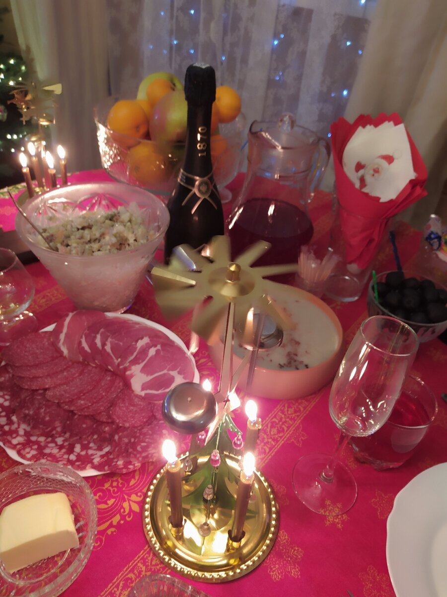 Забыла вам показать новогодний стол. Могла, кстати, подсунуть фотографии прошлого и позапрошлого года. Никто и не отличил бы))) Холодец, Оливьё, селёдка под шубой, икра, рыба, колбаса, оливки-маслины, морс клюквенно-брусничный. И так каждый год. В этом году никакие рулетики не делала. Отличия! Было 2 подсвечника-карусели Скатерть всегда была льняная из Костромы, в прошлом году купила тоже костромскую, но хлопковую. В итоге после первой стирки она в местах сгиба выбелилась. Я такими скатертями пользуюсь сто лет, но светлыми. И ещё раскопала салатник. Когда-то его оставили мне в наследство жильцы. Они прожили в моей квартире 10 лет и из неё уехали сразу в Израиль. Оставили кучу всего ненужного, но немного нужного тоже перепало. Салатник хрустальный. Мне он очень понравился формой, на столе занимает мало места Моя любимая стеклянная рыбка с икрой. Каждый год вам её сватаю) Она сделана из очень толстого стекла, что создаёт оптический эффект. Кажется, что икры там грамм 200, а не 100. Со св