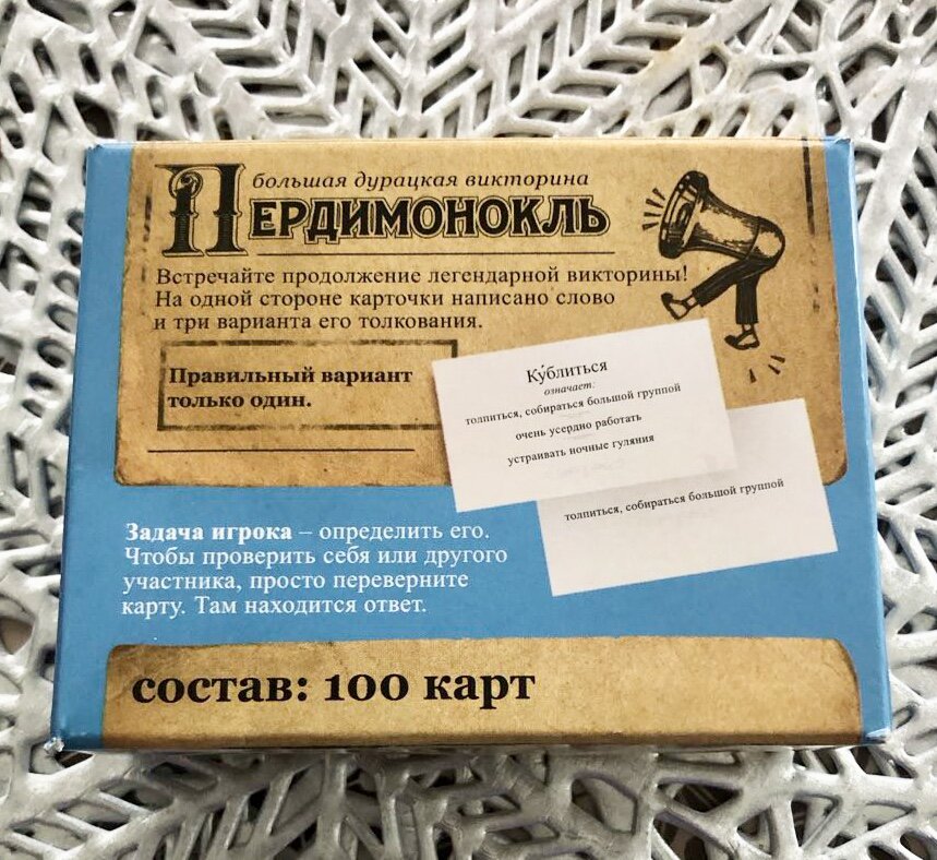 Если вы ищете игру, которая была бы развивающей, интересной и компактной, то присмотритесь к "Пердимоноклю". Это такая игра, в которой нужно объяснить значение устаревших и редких слов. Не смотря на название «Большая дурацкая викторина», игра очень даже ничего! Пердимонокль произошло от французского perdit monocle - «теряет монокль». Выглядит игра ну крайне просто. Обычная картонная коробочка, а внутри карточки. Их 100 штук. На каждой карточке указано слово, а затем 3 варианта ответа. Один из них и будет правильным. На оборотной стороне он как раз и указан. По-моему мнению, игра рассчитана на взрослых, но если ваш ребенок будет рядом, то он довольно быстро запомнит правильные ответы и расширит свой кругозор. Это прекрасная игра в дороге, не занимает много места. Нужен лишь ведущий, называющий слово и варианты ответов. Остальные выбирают правильный. Конечно, со временем, все слова запоминаются. Но происходит это через довольно большой промежуток времени, так как карточек много. Мне п