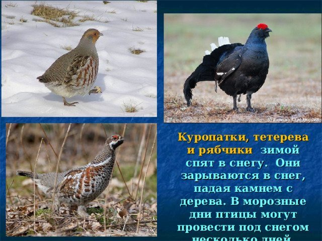 Птицы,как и люди,ищут места,где теплее и сытнее. Есть в наших краях птицы,которые спасаясь от ястреба ночуют и пячутся в снегу.Поспорили куропатка, рябчик и тетерев,что обхитрят ястреба,когда он прилетит за ними охотиться.А пока кормились в лесу, радовались хорошей погоде и солнышку. Рябчик строил себе ходы в снегу, да на небо посматривал. Тетерев искал себе корм на деревьях и накапливал подкожного жира.Одна куропатка летала днем то в деревню,то сидела в лесу ,раскачиваясь на ветке.Все были заняты своим делом.Один ястреб летал высоко в небе и наблюдал, выискивая себе пищу.Вдруг он быстро,быстро стал приближаться к земле.Все птицы заметили опасность. Рябчик сразу нырнул в ход и снег скрыл его.Тетерев ,как убитый ,провалился с головой в снег.А рябчик прыгнул в снег,головой зарылся,он никого не видит,а про свой хвост и забыл.Схватил ястреб его за хвост,да и вытащил.А,кто из них умней ,решай сам.