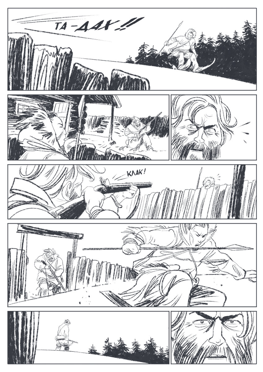 Он осторожно подкатывает ближе к частоколу и видит, как из дома выскакивает Робертсон. На его руках кровь, кровь на прикладе его ружья, он начинает вытирать его о снег. Вдруг Робертсон замечает индейца. В тот же миг он прикладывается к ружью, целясь в него. Клац! - ружье дает осечку.