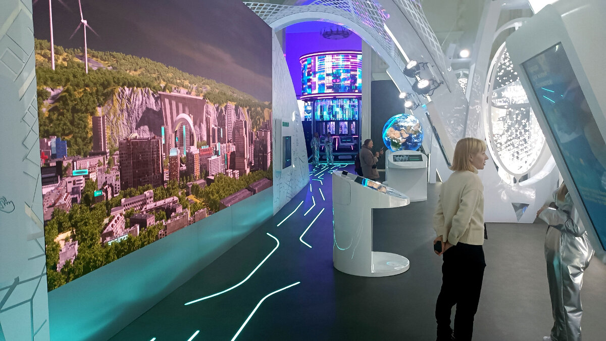 Встречает посетителей радиусный экран с обзором 270 градусов, на котором за несколько минут показывают, как изменилась жизнь в городах за 20 лет. Анимационный фильм – первый в России, созданный с использованием искусственного