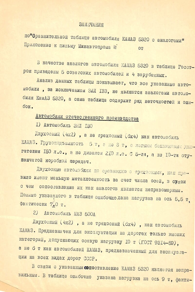 Людей, пытающихся принизить роль Камского автозавода в истории страны, хватало во все времена, начиная с того момента, когда конструкторы ЗИЛа ещё только проектировали новый советский грузовик с дизельным двигателем… Сегодня предлагаю вашему вниманию интересный документ конца 1960-х годов - «Замечания по «Сравнительной таблице автомобиля КАМАЗ-5320 с аналогами». Прочтите достойный ответ злопыхателям из 1960-х годов. Пусть он будет ответом на такие, например, сегодняшние бредовые высказывания некоторых «автоэкспертов», типа «КАМАЗ убил ЗИЛ» или «МАЗ и КРАЗ – это сила, а КАМАЗ подрезал крылья МАЗу». Увы, самой сравнительной таблицы, подготовленной специалистами Госстроя СССР, о которой упоминается в документе, в Музее КАМАЗа не сохранилось. Неизвестен также автор «Замечаний». Но считаю своим долгом показать этот документ, в котором автомобиль КАМАЗ-5320 не совсем корректно сравнили с автомобилями ЗИЛ-130, МАЗ-500А, КРАЗ-256Б, ЗИЛ-133, ДАЙМЛЕР БЕНЦ 1813, ФОРД ДТ 1400, ЛЕЙЛАНД БИВЕР, ЛЕЙЛА