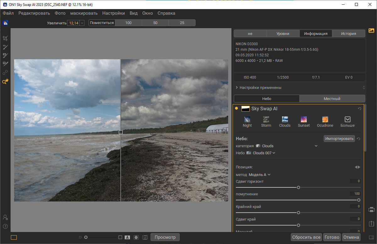 Программа обнаруживает небо на вашей фотографии и автоматически создает отличную маску.