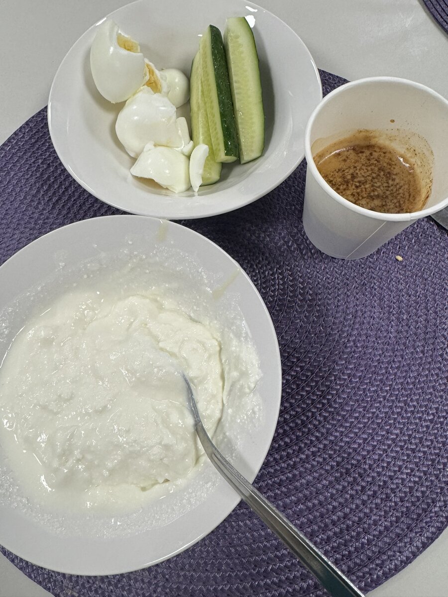 Помимо существенной экономии бюджета и времени, приятный момент - не надо ничего с собой таскать. И все же за пару месяцев я ощутила неприятные изменения. Не то, чтобы вес прибавился, но появилась какая-то отечность и тяжесть. Связываю это с тем, что в обычной жизни избегаю соли в еде, а здесь - всё соленое, хоть и вкусное. Поэтому решила с нового года все же следить, сколько и чего съедаю за день. Завтрак 9:00 Творог с ложкой сгущенки, два яичных белка, огурцы, эспрессо. Перекус 10:30 Поняла, что после завтрака осталась некая "недоговоренность". Со всех роллов всегда снимаю лишний лаваш, мне с ним слишком сухо. Обед 13:30 Супы у нас хороши тем, что порцию наливаешь сам. Я если беру, то побольше бульона. Сегодня шурпа. А на второе - кусок вареной говядины и капуста. Чай с плюшкой 15:00 Это пожалуй единственный вид выпечки из нашего ассортимента