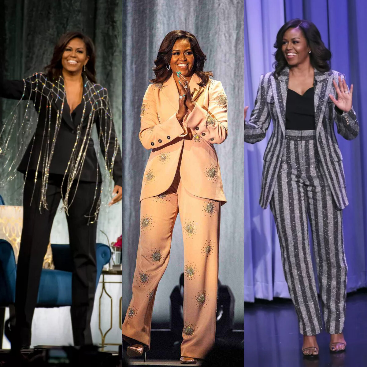 Бывшая первая леди выглядела элегантно и стильно в серебристом брючном костюме 12 мая 2020 года во время выступления в Нэшвилле в рамках своего книжного тура Becoming.