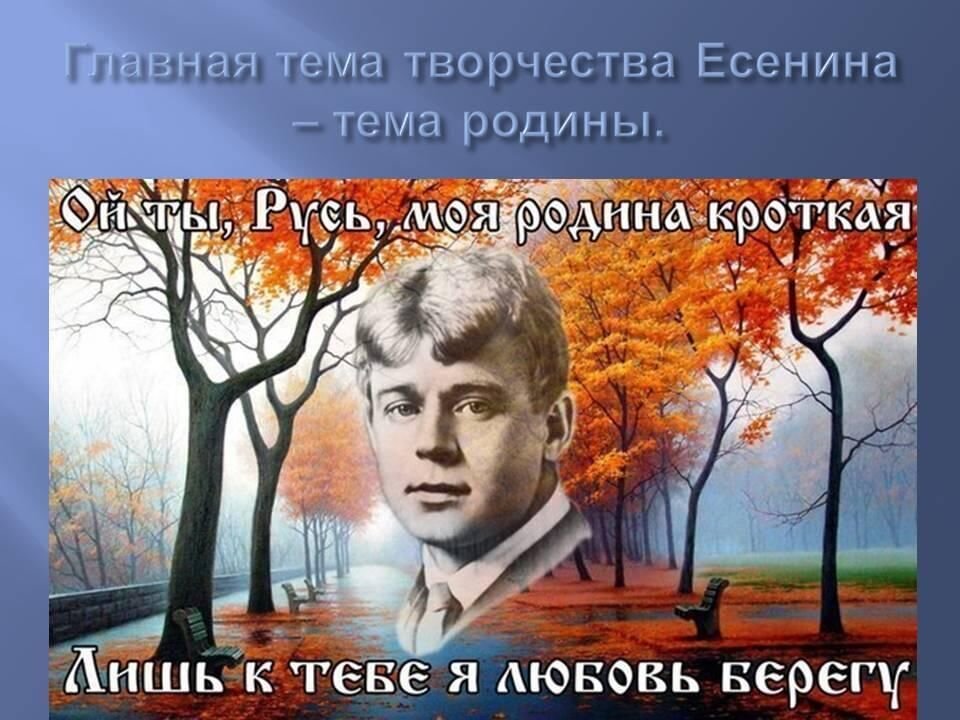 «Моя лирика жива одной большой любовью, любовью к Родине. Чувство Родины – основное в моем творчестве», – говорил Есенин. Поэзия Есенина необыкновенна своей предельной искренностью. Как писал Горький, «Сергей Есенин не столько человек, сколько орган, созданный природой исключительно для поэзии».