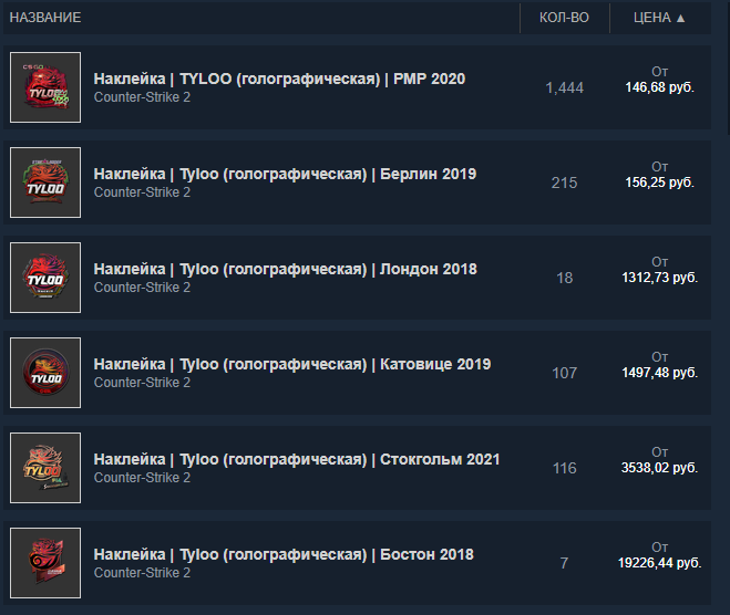 Цены на скины и наклейки в CS постоянно меняются в разные стороны. То резко растут на фоне инфоповодов, то резко падают во время сезонных распродаж. Умея предугадывать подобные события и следя за профессиональной сценой топовых команд и игроков, можно успевать делать очень грамотные и успешные инвестиции. Сегодня рассмотрим такой "инфоповод" как новый год. Многие знают, что СНГ рынок оказывает сильное влияние на Китайский рынок, тк у нас в регионе очень много инвесторов, которые знают что нравится китайцам. А нравится им Китайский новый год. И не просто новый год, а год деревянного дракона. Для китайских игроков дракон значит гораздо больше. И как вы знаете в CS есть немало вещей, которые олицетворяют дракона, а значит цены на них и полетят вверх. Поговорим о конкретных айтемах более подробно: 1) Наклейка Tyloo (голографическая) | Стокгольм 2021 На площадке не так много различных вариантов голографических наклеек с эмблемой китайского коллектива. Все они представляют красного дракона и