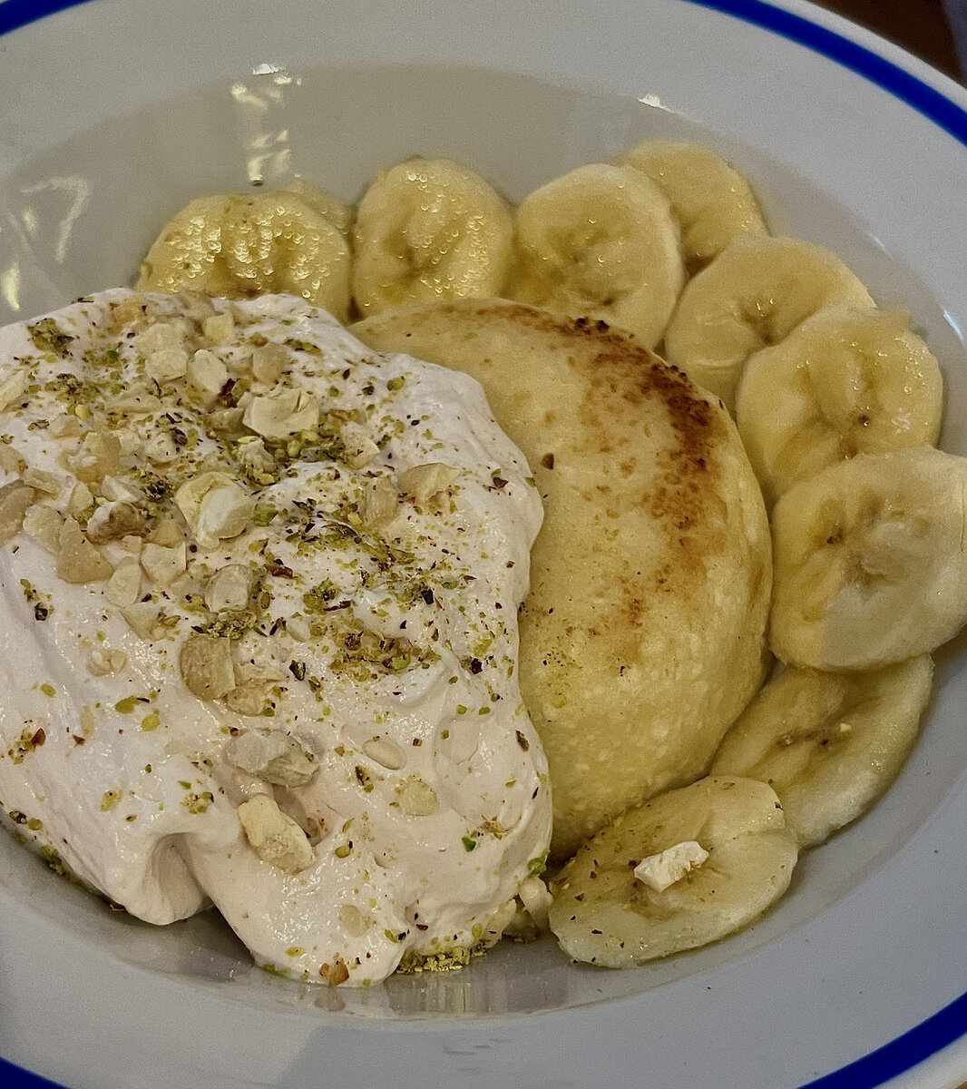 Сладость 2/5 Сырник с творожно-клубничным муссом, бананом и фисташковой посыпкой. Несмотря на размеры, сырник прожарен и имеет равномерную текстуру, у меня дома маленькие разваливаются, а здесь 4 в 1. Мусса достаточно на всю порцию. Легкий, воздушный, в меру сладкий, напоминает ягодный йогурт. Классические молочные напитки (раф, капуч и подобное) могут перебить вкус и добавить еще больше "тяжести", лучше насладиться блюдом под чай или же черный кофе (желательно, фильтр). Кухня у ребят только появилась, и в свежем меню есть много интересных позиций, которые мы распробуем чуть позже, может ты уже что-то попробовал?
