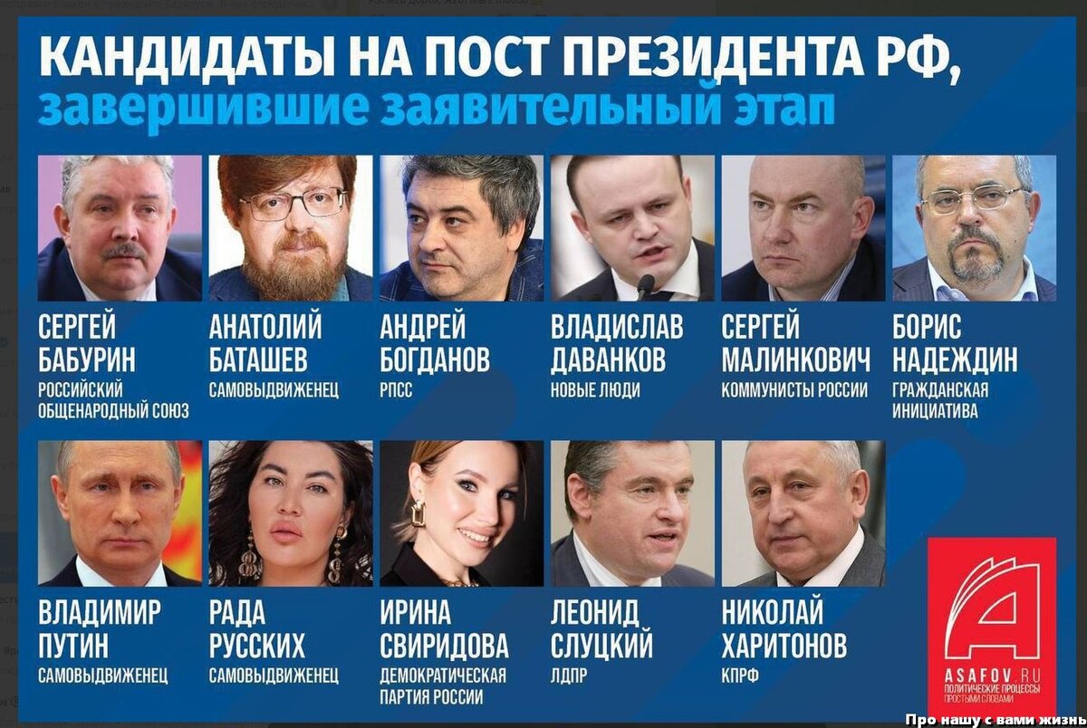 В далёком детстве читал книгу про одного из первых императоров франков. Кажется, Хлодвига. Так вот он частенько во время пиров высказывал глубокое сожаление, что у него нет родственников, которые в случае его внезапной кончины могли бы занять трон. Но дело в том, что родственников не было по очень простой причине, он их казнил. А разговоры эти начинал лишь с одной целью, выявить ещё возможных конкурентов. И конечно избавиться от них. Скоро выборы Перед вами, на мой взгляд самая позорная подборка кандидатов на пост президента России. Для того, что бы она выглядела ещё более жалко, надо было бы уже просто взять бомжей с улицы. До этого пока не дошли, но на следующих выборах похоже так и будет. Если у нас вообще будут следующие выборы. Либерал Кто у нас в стране знает такого политика? Никто не знает! Нет у нас такого политика. Есть некий либерал, который время от времени мелькает на теле-экране, где делает заявления, которые никому не интересны. Бабурин, Баташев, Богданов, Даванков, Малин