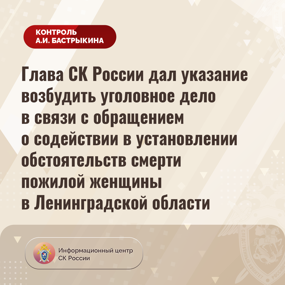 Глава СК России дал указание возбудить уголовное дело в связи с обращением о содействии в установлении обстоятельств смерти пожилой женщины в Ленинградской области