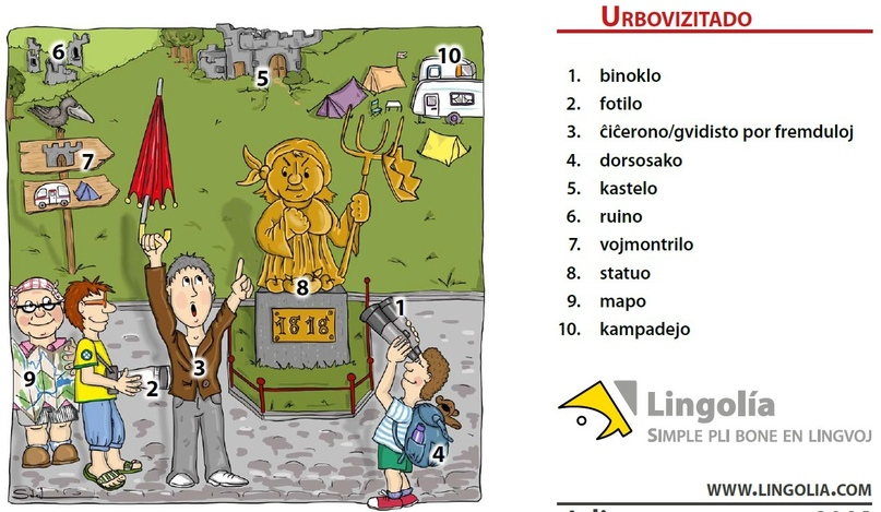 1. бинокль2. фотоаппарат3. гид4. рюкзак5. замок6. руина, разва́лина7. указатель дороги8. статуя9. карта10. (похо́дный) ла́герь, бива́к