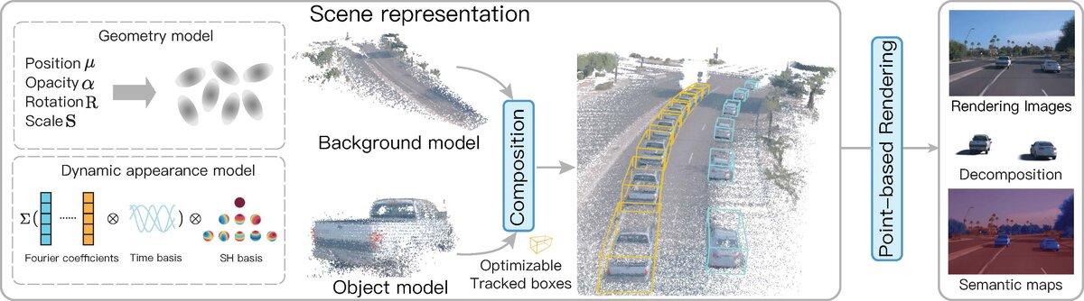 Группа исследователей из Чжэцзянского университета и Li Auto представила Street Gaussians — новый метод моделирования и представления оживлённых городских улиц при помощи набора облачных точек с семантическими весами и привязанных к ним 3D-гауссианами. Чтобы преодолеть ограничения существующих подходов, в методе оптимизируется каждое облачко точек объекта, включая отслеживаемые позы и динамическую модель внешнего вида на базе сферических гармоник. По словам исследователей, такое явное представление позволяет легко компоновать объекты и фон, расширяя возможности редактирования сцены и достигая скорости 133 кадра в секунду при разрешении 1066×1600 после всего получаса тренировки. Предложенный метод оценивался на нескольких сложных тестовых наборах, включая KITTI и Waymo Open Dataset. Эксперименты показывают, что он последовательно превосходит лучшие существующие методы. Дополнительные примеры динамических 3D гауссиан сцен можно найти по ссылке. Подробнее о Street Gaussians и код можно уз
