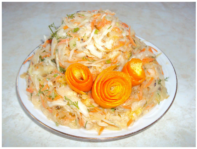 Капуста тонко шинкуется и хорошо разминается. Соленые огурцы строгаются на крупной терке. Цедра с апельсина срезается вместе с мякотью таким образом, чтобы апельсин остался «голеньким».