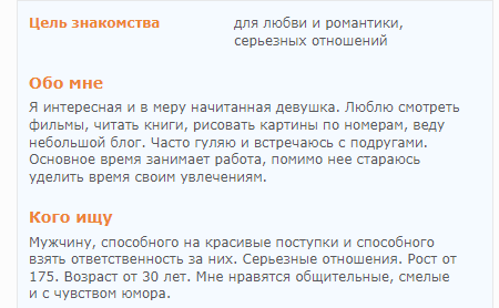 Вот такой опус я нашел на одном из сайтов знакомств. В нем прекрасно все. Слог, манера речи, попытка напустить романтики и попытка скрыть интерес к материальным ресурсам мужчины. Давайте разберем. Примерный автопортрет владелицы Нам открывается девушка с каким-никаким кругозором. Читает, вроде бы... Имеет хобби, интересы. Ну, почти мой идеал. Есть работа, то есть, сама себя обеспечивать вроде бы в состоянии. А поскольку есть время и на увлечения, то есть и какой-никакой график. То есть, свидание не сорвётся из-за того , что ее внезапно вызовут на работу. Но стоит опустить глаза ниже... Подводные камни Ищу мужчину , способного на красивые поступки... Стапэ! А есть какие-то критерии красоты поступков? Границы? Нет? Тогда это игра в одни ворота, причем без правил. Как говорил один ведьмак: любую оплату можно счесть недостаточной. Так и здесь. Любой поступок можно счесть недостаточно красивым. ... и способного взять ответственность за них. Так за эти поступки ещё и ответственность насту