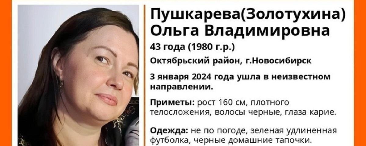В Новосибирске третью ночь подряд продолжается поиск Ольги Пушкаревой, которая ушла из дома в футболке и тапочках. Волонтеры поискового отряда «Лиза Алерт Новосибирской области» разместили информацию о пропаже жительницы областной столицы. По данным волонтеров, 43-летняя женщина ушла из дома в Октябрьском районе только в домашней одежде и тапочках, несмотря на температуру в -21°С Ольга Пушкарева (Золотухина) пропала без вести 3 января 2024 года. Ее местонахождение неизвестно, и вызывает опасение ее физическое состояние на фоне резкого похолодания. Информацию о местоположении Ольги Пушкаревой можно сообщить по телефонам: 8-800-700-54-52, 112 Напомним, ранее в Красноярске пропал 20-летний баскетболист — сообщается, что он погиб.