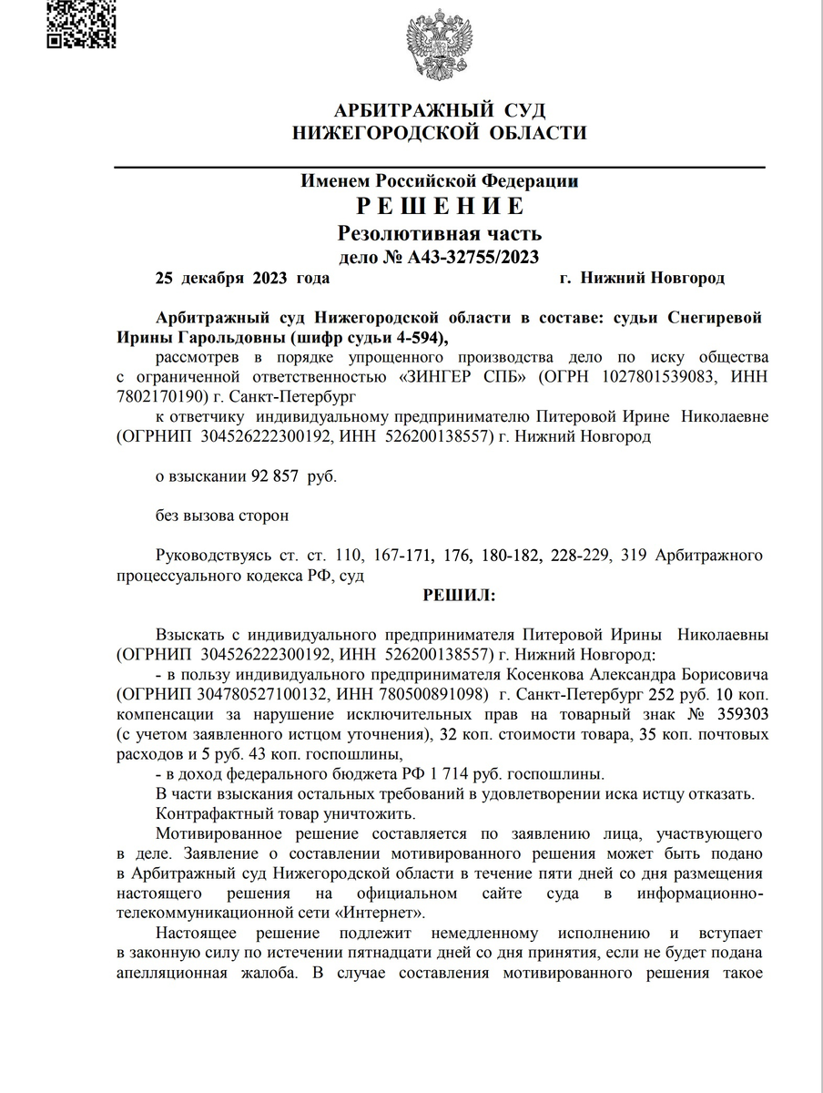 Всего 252 руб. компенсации вместо 92 800 руб. получит ИП Косенков А.Б. по иску к моему доверителю. Такого ещё не было в практике судов по искам данного правообладателя. Дело № А43-32755/2023. Поздравляем Ирину!