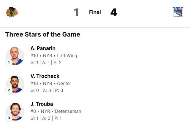 Артемий Панарин очень любит огорчать свою бывшую команду: в этот четверг российский форвард «Рейнджерс» в очередной раз набрал очки во встрече с «Чикаго», став одним из протагонистов победного (4:1) для «синерубашечников» матча. 10-й номер ньюйоркцев открыл счет в поединке, завершив атаку убойным броском в верхний угол. Вторым результативным баллом Панарин отметился на старте третьего периода игры, снабдив голевым пасом Джейкоба Трубу. В этом матче с Артемием также приключился один не самый приятный эпизод, когда шайба попала ему в лицо после передачи от Трочека, однако 32-летний российский нападающий вернулся на лед через несколько минут. Искристый перфоманс Панарина оценила Национальная хоккейная лига, признав Хлебушка первой звездой встречи. Под впечатлением от игры Артемия остались и американские поклонники хоккея. @RealPJS:– Тройка Панарина с Лафреньером и Трочеком снова выдала волшебный матч. Это сочетание – двигатель «Рейнджерс». @SuitableAlias:– Если брать и личностные качества