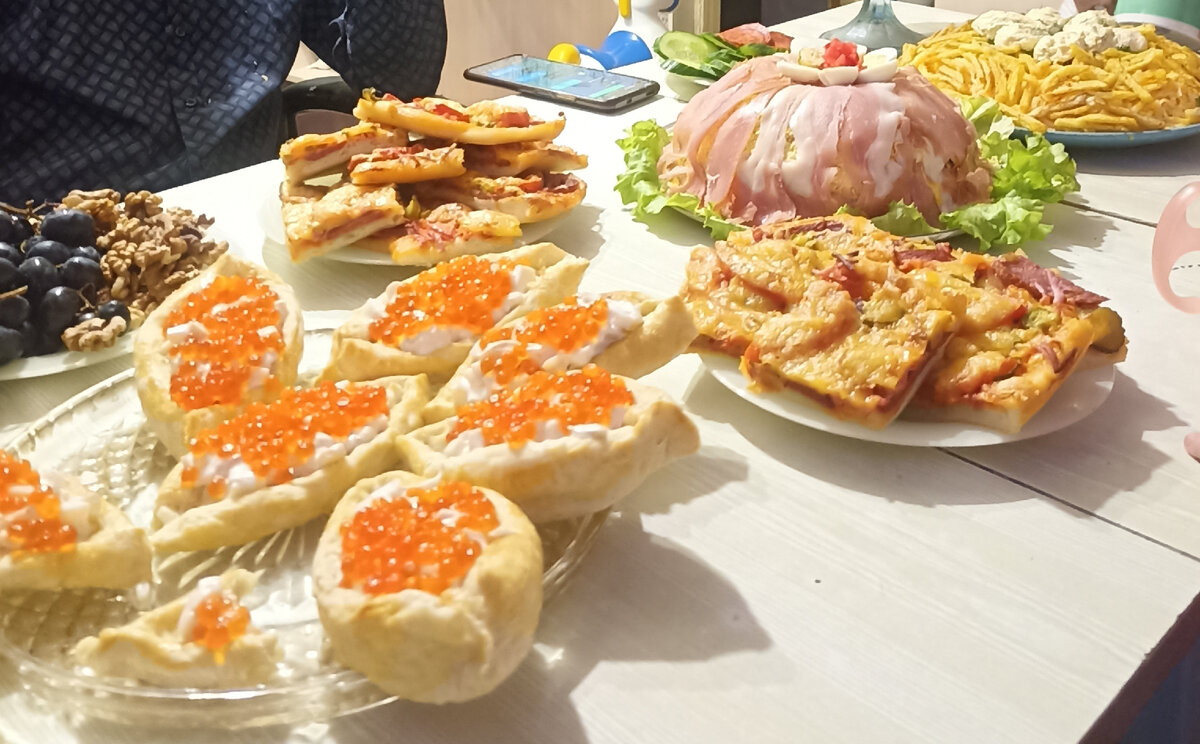 Пока дети с восторгом играли новыми игрушками мы стол накрыли. По телевизору песни поют, мы пузо набиваем. Классика.