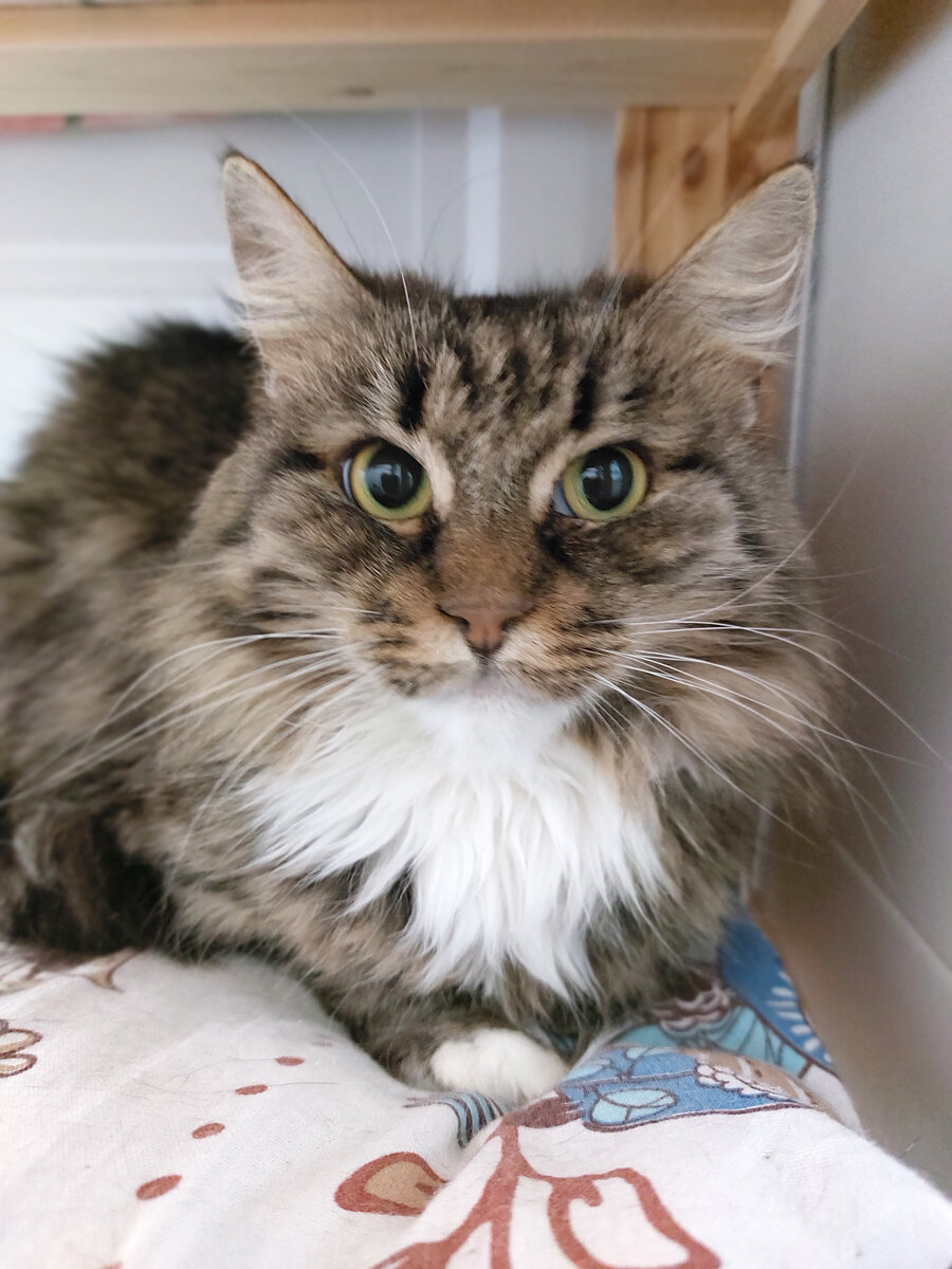 Жаклин — гордая и знающая себе цену обитательница приюта «Пушистый друг» в Малинках. Она носит красивую меховую шубу черно-коричневых тонов и несколько свысока смотрит на посетителей. На шее у нее аккуратный белый шарфик, на лапках — белые же перчатки, и она складывает лапки в замочек, чтоб ненароком свой туалет не запачкать. Мы не знаем, как Жаклин попала в приют. Но выглядит она великолепно, сразу обращаешь внимание на ее хорошие манеры. Возможно, Жаклин — правнучка русских эмигрантов, наводнивших Париж после революции. Иначе чем объяснить эту подлинную аристократичность и умение держать себя в любом обществе, где бы она не оказалась? И одновременно в ее строгом взгляде прослеживается легкая тоска и сентиментальность, так свойственные истинно русской душе. Кошка не из доверчивых, ей придется доказывать благородство своих намерений. Но настоящую преданность и верность Жаклин, разумеется, оценит по достоинству и вознаградит своим вниманием и душевным теплом. Просто аристократы на доро