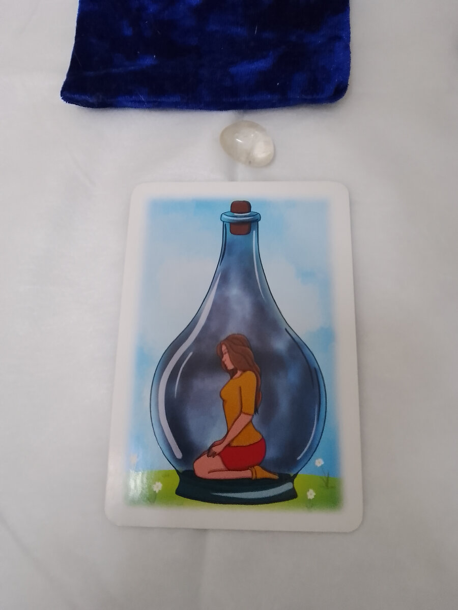 Начинаем рассматривать расклад второго варианта( камень карты горный хрусталь). Начало статьи и первый вариант здесь Первая карта описывает проблему( сложившуюся ситуацию, которая вызывает у вас дискомфорт). Девушка сидит в бутылке, которая плотно закупорена . Сама бутылка стоит на зелёной лужайке, вокруг которой цветы, небо. Поза девушки смиренна, руки сложены на коленях и она, даже, не пытается выбраться, или, просто, осмотреться вокруг. О чем это говорит? Сейчас вы находитесь в определенной стагнации. В своем внутреннем мире, который полностью закрыт от внешних влияний . Я не имею ввиду, что закрыты физически( хотя, не исключаю). Возможно, внешне вы вынуждены взаимодействовать с миром, но внутренняя закрытость почти абсолютна. По карте нельзя сказать, что вы в отчаянье, скорее , смирились уже, но желания что- то изменить и разрушить внутреннюю скорлупу, нет. Расклад общий и я не могу предполагать всех деталей и жизненных обстоятельств, которые привели вас в такое положение . Втор