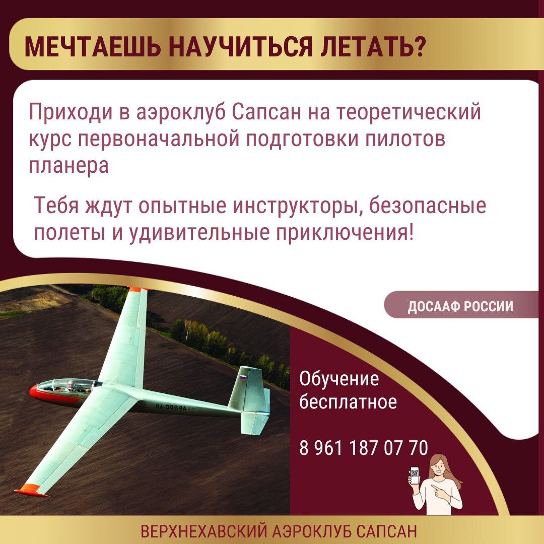 ВНИМАНИЕ! Стартует курс первоначальной учебно-летной подготовки пилота планера. Занятия будут проходить еженедельно в удивительной атмосфере аэроклуба Сапсан. Что тебя ждет? - Опытные инструкторы: ты получишь знания и навыки у профессионалов, которые сопровождали множество молодых пилотов в их первых полетах. - Безопасность: твое благополучие для нас на первом месте - мы тщательно следим за соответствием всех мер безопасности во время занятий. - Теория и практика: ты освоишь теоретический курс планеризма и сразу сможешь применить полученные знания на практике во время летних полетов. - Уникальный опыт: полет на планере - это незабываемое приключение, которое запомнится на всю жизнь. - Часть занятий будет проходить на единственном в стране виртуальном тренажере «Стратус». Будь готов испытать смешанные чувства восторга, свободы и невероятного ощущения полета без мотора! Не упусти свой шанс почувствовать, как ты паришь в небесах! Записывайся к нам уже сегодня! ДЕТАЛИ: Возраст: от 15 лет