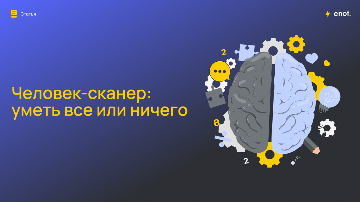 Человек-сканер – это термин, который используется для описания людей, увлекающихся многими вещами, при этом не имеющих привычки углубляться в какую-либо одну сферу деятельности. Они часто переключаются с одной задачи на другую, пытаясь охватить как можно больше разных профессий и не только.