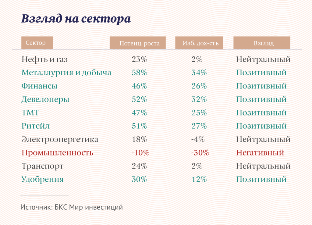 Потенциальными рекордсменами в БКС считают финансовый и технологический секторы, а также металлургию. Нефтянка, как ожидается, вырастет на уровне рынка (то есть примерно на 20%). Промышленные компании же, наоборот, имеют все шансы показать слабый результат — так же как и строительная отрасль.