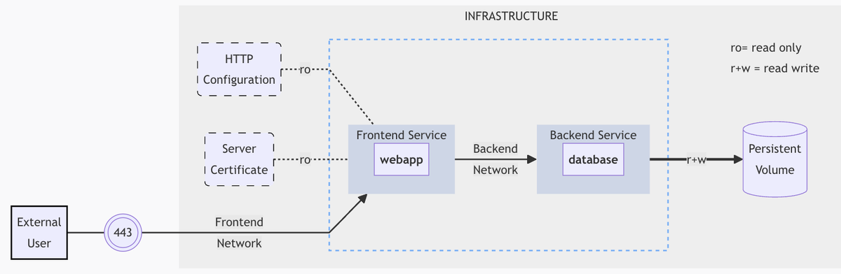 Бэкенд хранит данные в постоянном хранилище. Оба сервиса взаимодействуют между собой при помощи изолированной backend сети, фронтенд также состоит во фронтенд сети, открывая https порт 443 наружу.