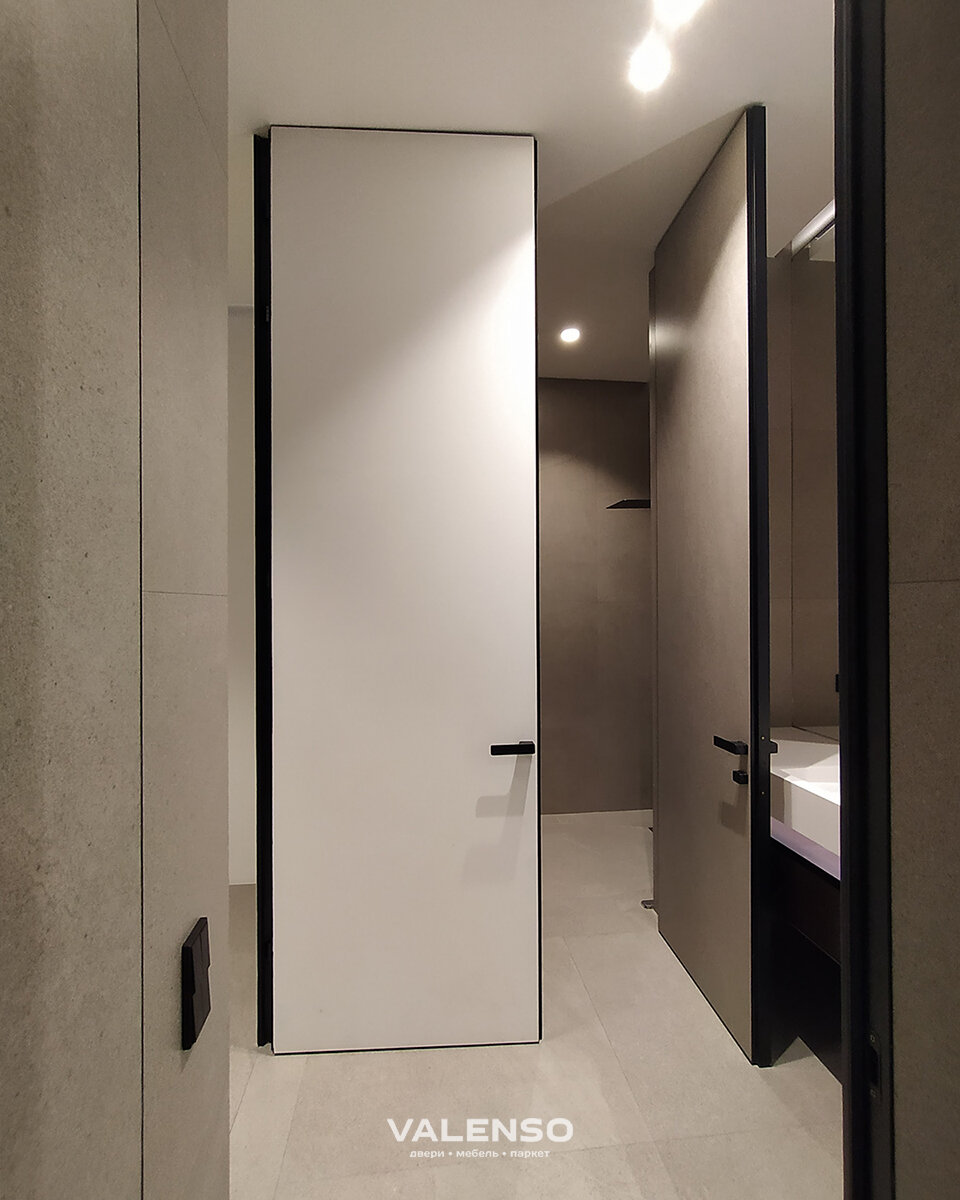 Как вы хорошо знаете, мы изготавливаем и устанавливаем двери. В основном это индивидуальные решения, выполненные для каждого конкретного проекта. Уже давно сложился тренд на высокие двери до потолка, коробка у которых не имеет верхней траверзы — то есть в дверном проёме потолок ничем не разделяется, оставаясь единым целым. Такие двери мы делаем с помощью алюминиевого профиля, который позволяет создавать дверное полотно высотой до 3000 мм.