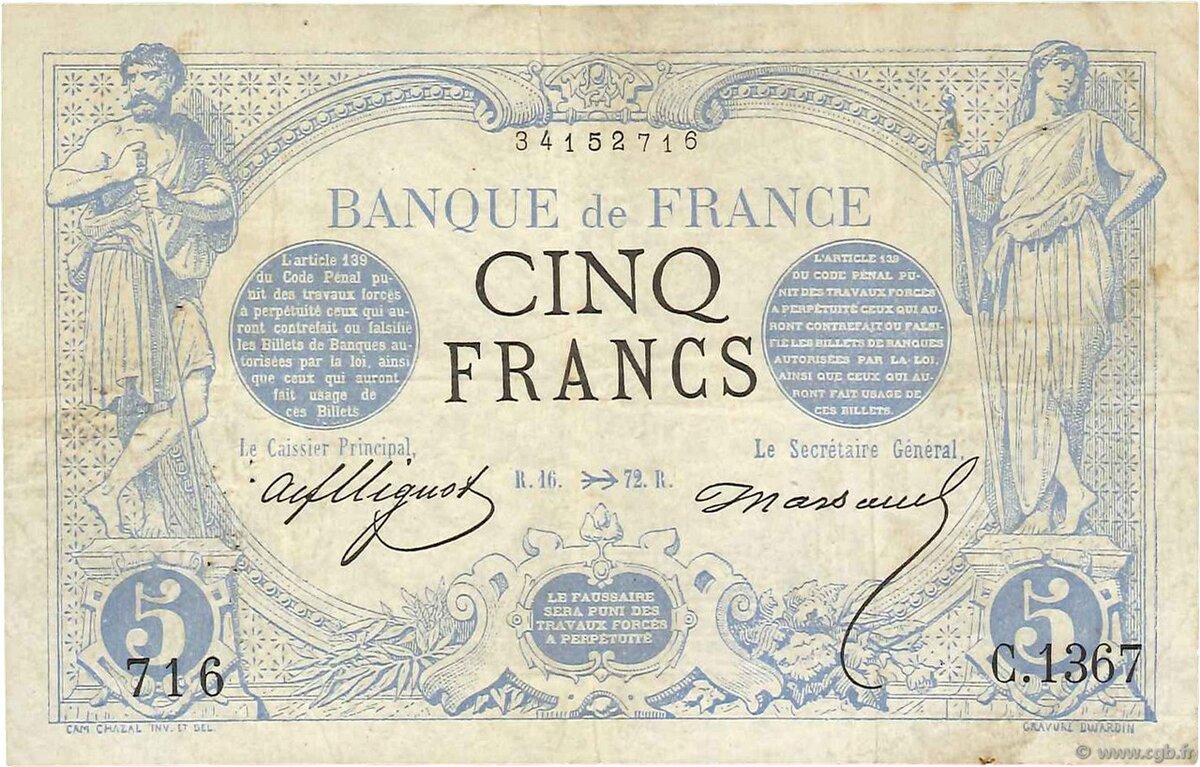 Французская купюра в пять франков, впервые выпущенная в 1872 году, носит название «Зодиак». Почему такое название? Для начала, вот при каких обстоятельствах она появилась в обращении. Франко-прусская война 1870-1871 годов не прошла бесследно ни для какой из сторон жизни французов. Серьёзные экономические трудности, вызванные войной, тяжёлые условия капитуляции, выдвинутые победителями, легли огромным грузом на экономику Франции. Это не могло не отразиться на денежном обращении страны: повинуясь закону Майкельсона-Шварца Коперника-Гришема из денежного обращения стали пропадать золотые и серебряные монеты, а также купюры крупных номиналов. Для восполнения недостатка монет из драгоценных металлов в самом конце 1871 года был приняты законы, в соответствии с которыми Банку Франции было предоставлено право печатать купюры в 5 франков. Знаки таких номиналов были выпущены впервые: ещё накануне войны самые мелкие билеты Банка Франции имели номинал 50 франков, а в 1870 и 1871 годах были отпеча