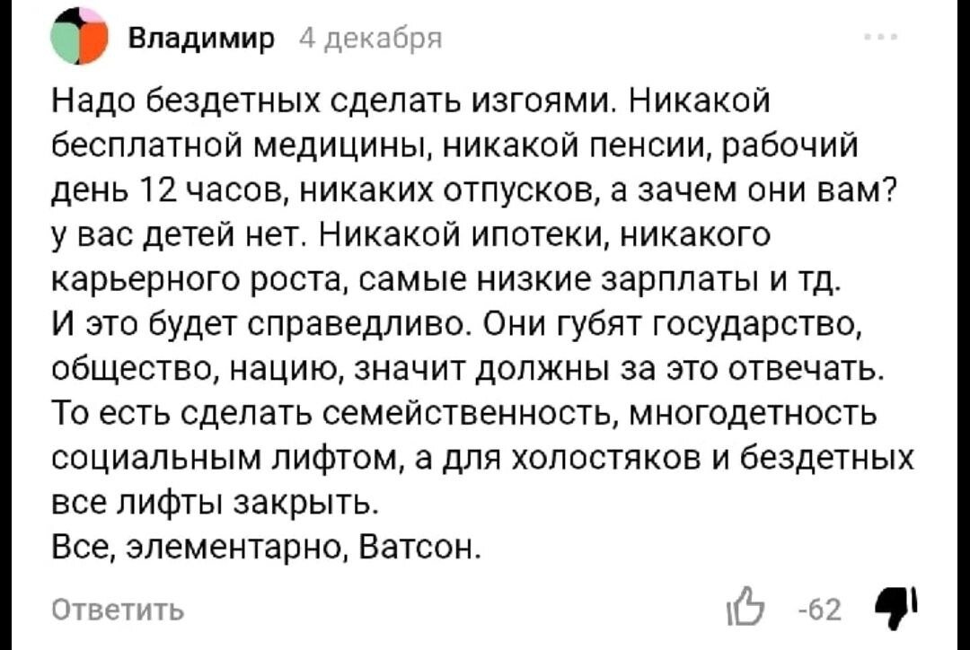 Не всегда радикальные идеи идут “сверху”, иногда они идут “снизу”. Кто, кроме самого народа, знает свои слабые места. Это вам не оторванные от жизни простого народа депутаты. А еще некоторые представители народа мечтают, в лучших традициях Шарикова, всё “взять и поделить”. Но перед этим, разумеется, у “зажравшихся” эти блага предварительно отнять. В этот раз в роли зажравшихся выступают бездетные люди У меня это ничего, кроме смеха не вызывало, особенно по 12-ти часовой рабочий день, это наказание, оказывается. Но давайте по порядку: Если не брать экстренные случаи - бесплатной медициной у нас себе могут позволить пользоваться только в целом здоровые люди. Сколько раз было - вроде что-то начало беспокоить, надо бы записаться, пока дождешься записи - как-то уже вроде и прошло. Ну или в интернете прочитала, чем лечить, пошел в аптеку, купил лекарства. Да-да, самолечение - вред. Хочешь быстро и внимательного отношения (и то не факт) - иди в частную клинику, плати денежку. Допустим, ее не